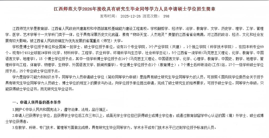 江西师范大学2026年接收具有研究生毕业同等学力人员申请硕士学位招生简章正式公布,本次招生覆盖教育学、经济学、管理学等多大门类,想通过同等学力申硕提升学历的同学,这些关键信息一定要掌握!👇