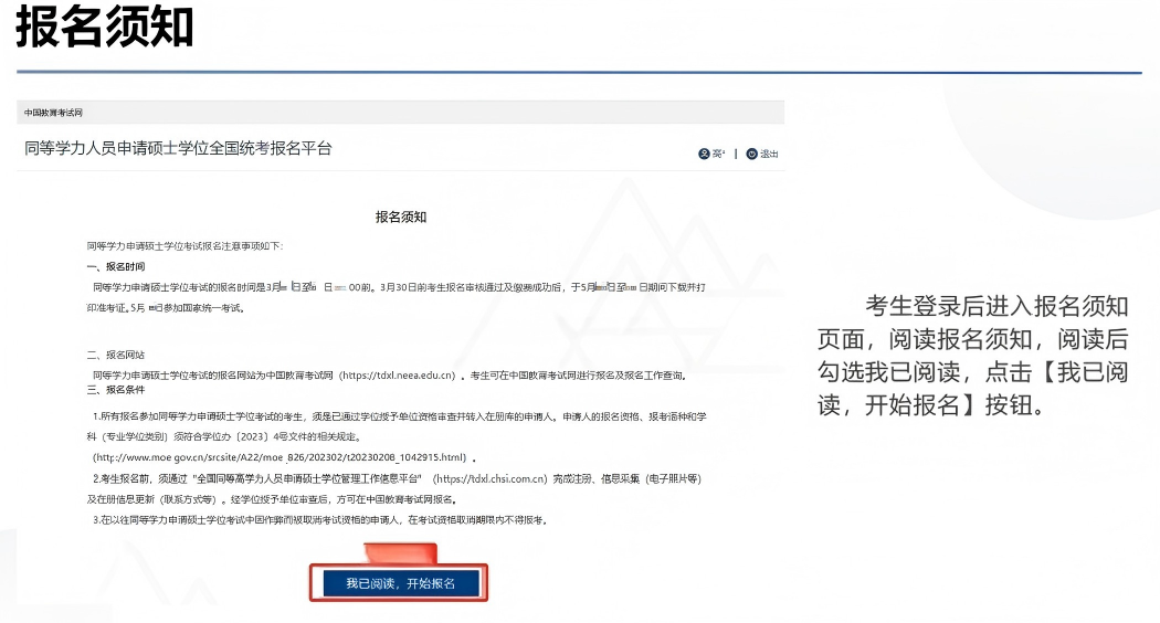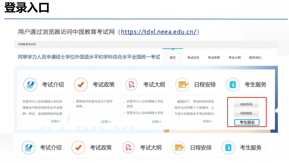 符合报考资格的考生须于3月16日至26日16:00前在中国教育考试网(https://tdxl.neea.edu.cn/,,服务电话:010-82520230,接听时间:工作日9:00~17:00)报名,填报同等学力全国统考的语种、及考试地点,并实时关注审核结果。考生可选择报考学位授予单位、工作单位所在省(自治区、直辖市)参加考试。