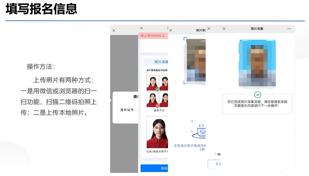 答:上传照片的大小及格式需符合要求,上传成功会在上传页面显示预览图片,若未看到预览图片或提示“上传失败”则表明未上传成功。若多次尝试后仍无法成功上传,建议更换浏览器。
