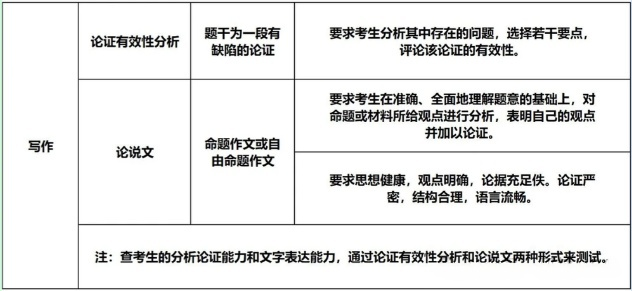 ③写作:含论证有效性分析与论说文两个部分。论证有效性分析,主要是找出文章论证过程中存在的逻辑缺陷,需要点出逻辑漏洞并加以论证;论说文,需要准确全面理解题意的基础上,表达自己的观点并加以论证。