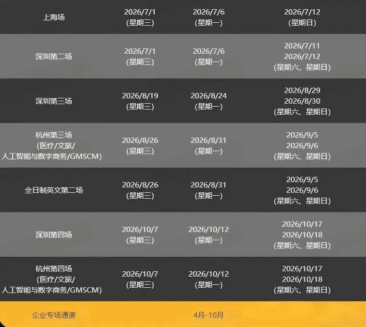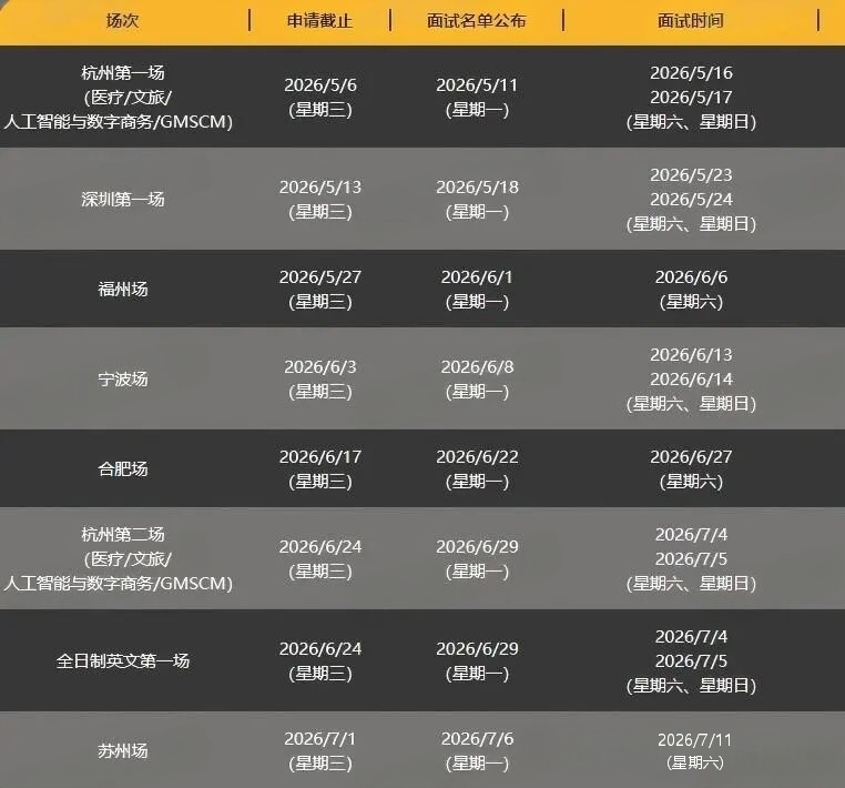 其中,全球制造与供应链管理项目(GMSCM)、全日制英文MBA项目、非全日制中文MBA项目中的文化和旅游产业专业方向、医疗健康产业专业方向、人工智能与数字商务专业方向开设专场面试通道。